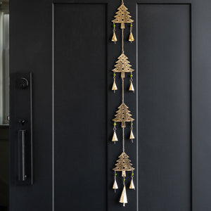 Take a well-deserved break and let the soft, soothing tones of this handcrafted chime bring calm to your home. Featuring four wintry pines made from recycled iron, adorned with festive star cutouts, brass bells, and green glass beads, this chime evokes tranquility and peace—perfect for those quiet holiday moments.