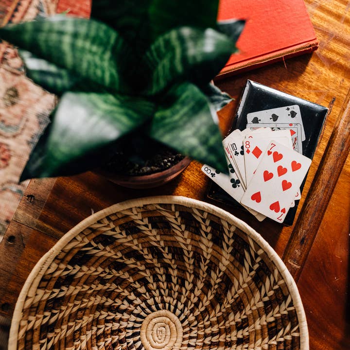 This basket is hand‒woven by women working with Uganda Crafts, an artisan group that provides single mothers widowed by the HIV/AIDS epidemic the opportunity to earn income weaving at home.