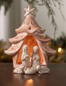 Celebrate the story of Christmas with this beautifully handmade nativity set, crafted from natural terracotta clay and finished with a rustic whitewash. This eco-friendly set features five removable figurines—the Holy Family, a donkey, and a sheep— each detailed and shaped by hand. Display the figures inside the tree-shaped crèche or arrange them in front. Add a warm, radiant glow by placing an LED candle (not included) behind the scene.