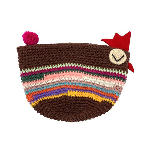 You won't find a cuter purse than this pouch made of crocheted cotton. Along with a beak and a comb made of felt, the chicken has a colorful pompom that serves as a zipper pull. Assorted colors.