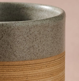 Made from natural clay, this artistically crafted mug features an orange band atop a grey speckled grey glaze that highlights the smooth, glazed rim, interior and handle. The brushed, etched texture below adds a tactile, earthy contrast that turns every cup into a stylish sip.