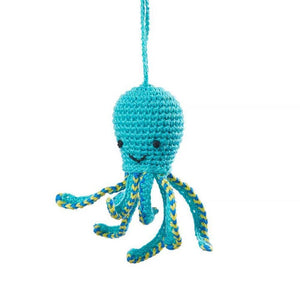 This colorful and whimsical handmade Christmas ornament is crocheted by skilled artisans and finished with tiny beaded eyes and polypill stuffing. A perfect addition to any holiday tree, or a great gift topper! Hand-crocheted hanging loop. 4"h.