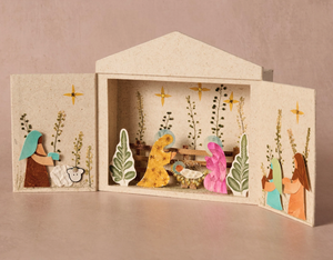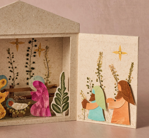 Celebrate the beauty of the season with this stunning holiday piece highlighted by a delicate fusion of faith and nature. Framed in a natural chipboard box, this miniature scene features the Holy Family and the Three Kings, each figure lovingly rendered from dried flowers, fossilized leaves, handmade paper and grasses.