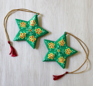 Hand-painted with vibrant colors in a beautiful floral pattern, this Paper Mache star ornament adds a lively and festive touch to your holiday décor. Complete with a gold cord hanger, it’s a delightful piece that will quickly become a cherished holiday favorite.